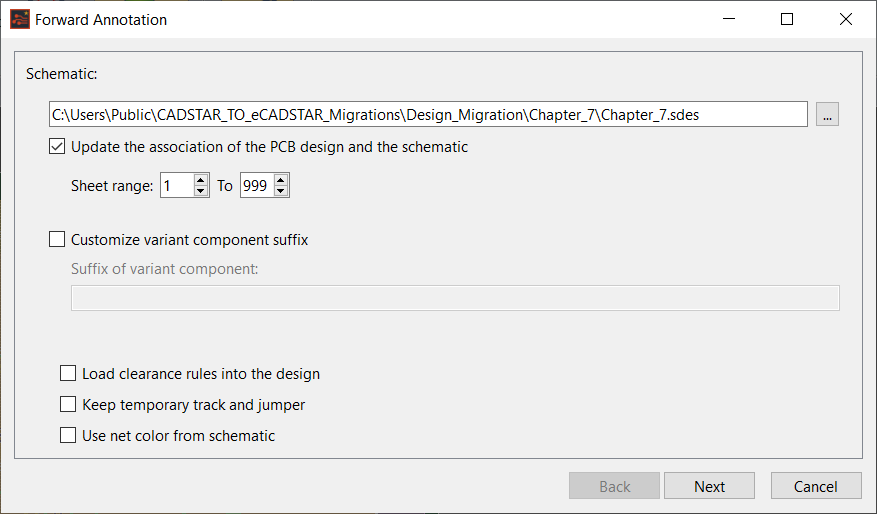 If clearance classes have been used, then after you Forward Annotate the design you must execute the Backward Annotation command to copy them from eCADSTAR PCB Editor to eCADSTAR Schematic Editor.