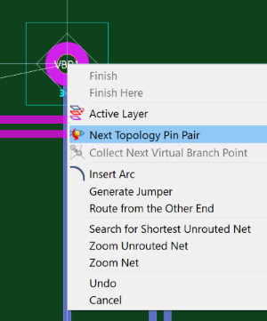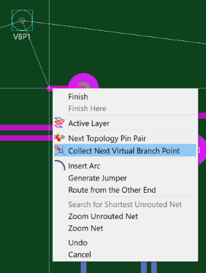 - Right-click, and select Collect Next Virtual Branch Point on the assist menu. The virtual branch point will snap to the via.