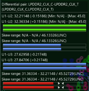 - Click the routed Differential Pair. Some of the dependencies that are required to route it are displayed in the Routing Balloon. A red bar is displayed at the bottom of the Routing Balloon. This shows the maximum pin pair length of 45 mm that is set for the Differential Pair.