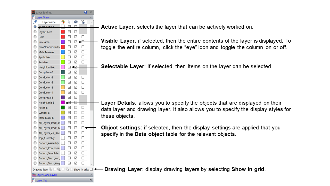 The Layer Settings panel allows you to select the active layer, along with setting the visible layers, style and selectable layers. The panel consists of the following parts: