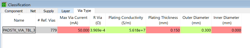 - In the eCADSTAR PI/EMI Analysis module, Classification view, select the Via Type tab. All the via types in the design are listed.