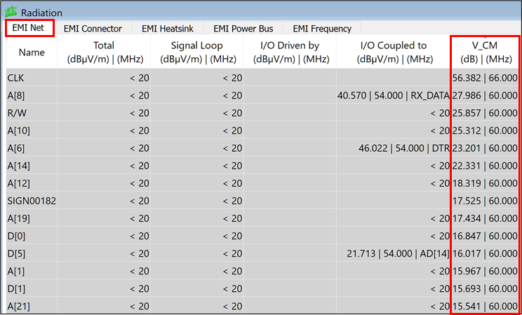 - Select the EMI Net tab, and click the V_CM (common mode voltage) column label. This sorts the values in descending order. Note that the value of "CLK" is the largest. As the common mode voltage represents the degree of common mode voltage drop, this indicates that "CLK" is the primary cause of the common mode noise.