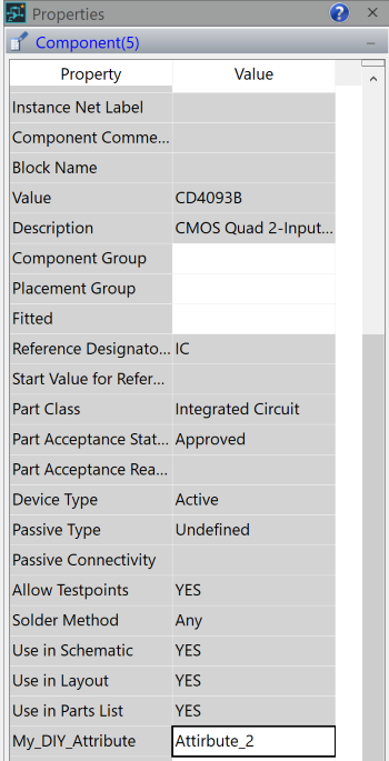 2. On the sheet in eCADSTAR Schematic Editor, select the component "IC6 (CD4093BM96)" and locate the attribute My_DIY_Attribute in the Properties panel.