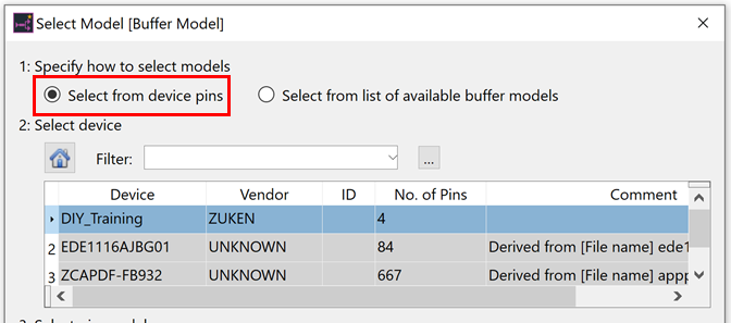 Choosing Select from device pins in the 1: Specify how to select models section allows you to assign a device-aware buffer model, including the package components contained in the device.