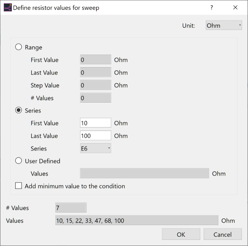 Values for the series are applied in the # Values and Values boxes. These indicate the range that is applied in the parameter sweep analysis.