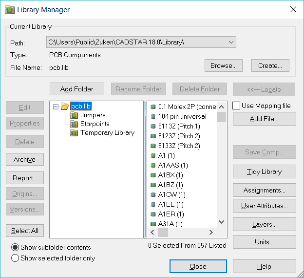 - Launch CADSTAR Library Editor application, and ensure that the selected library is: C:\Users\Public\Zuken\CADSTAR 2018.0\Library.