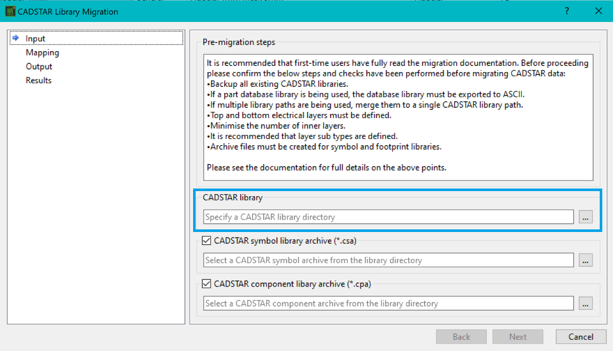The CADSTAR to eCADSTAR Migration Tool refers only to a single directory when migrating library data. Multiple CADSTAR library paths are not supported.