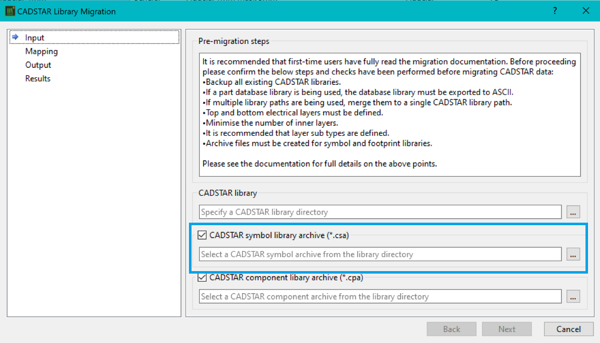 The CADSTAR to eCADSTAR Migration Tool refers only to a single archive (csa) file when migrating library data.