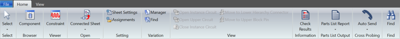 Some tabs have been removed in eCADSTAR Schematic Viewer, when compared to eCADSTAR Schematic Editor. Commands from the deleted tabs have been relocated to the Home tab. Group names on the ribbon have also been renamed, where appropriate. For example, the group name Design Rule Checking has been changed to Information.