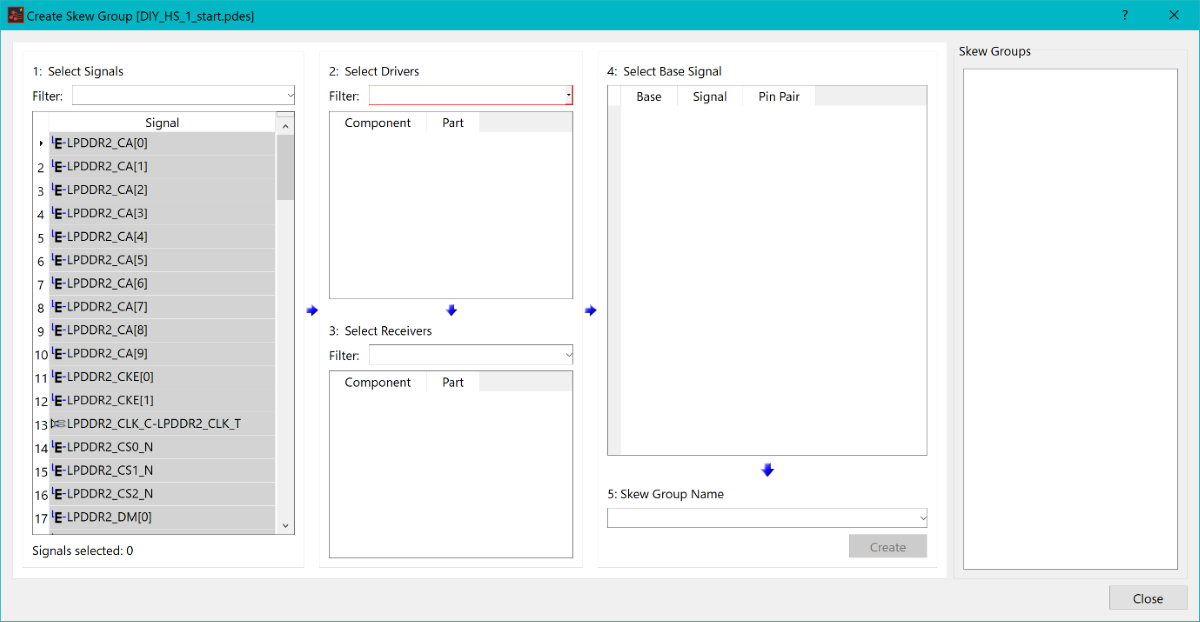 | 1. Select Signals | 2. Select Drivers | 3. Select Receivers | 4. Select Base Signal | 5. Skew Group Name |