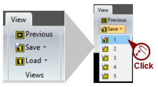 - From the View tab, click the Save icon as shown. Note that there are 5 available locations in which to store different views. Store the image to the required location.