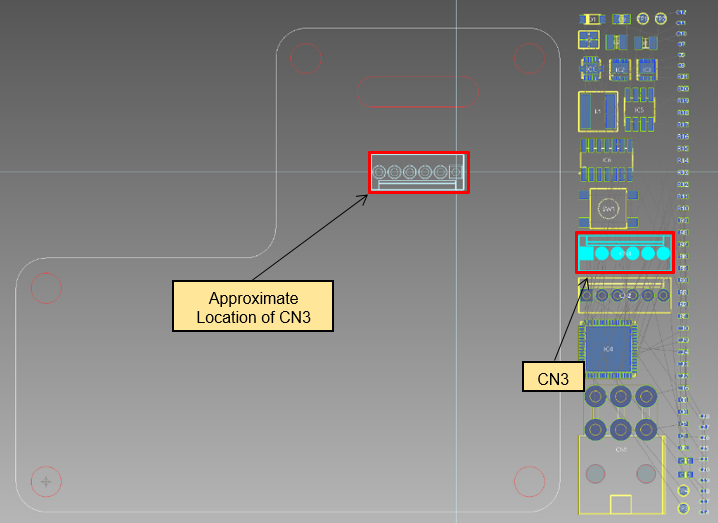 - Ensure that layer Conductor–1 is selected. Select component CN3 by pointing the cursor at it, pressing the Shift key, and dragging it into position on the board. Use the placement diagram below to estimate the placement location, release the mouse button when ready to place the component.