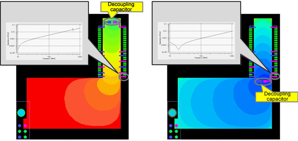 The PI Analysis module in eCADSTAR models power and ground planes equivalently using the LCR (Inductance, Capacitance, Resistance) grid method. It also analyzes resonance (Impedance) between those planes. This method is used to display an impedance map, which shows the characteristics of power and ground planes (input impedance) when viewed from the pin coordinates of an IC.