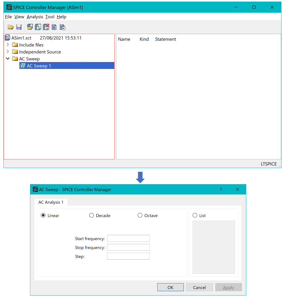 SPICE Controller Manager. - Select AC sweep Analysis and click OK.