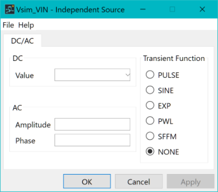 1. Double click Vsim_VIN in the expanded list. The Independent Source dialog is displayed.