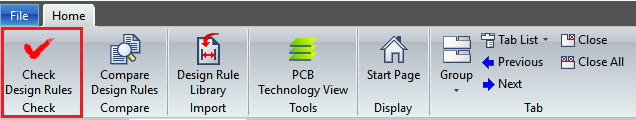 The Check Design Rules command allows you to check that all tabs in the Design Rule Editor have been completed correctly. Run this command by clicking Check Design Rules on the ribbon, as shown below.