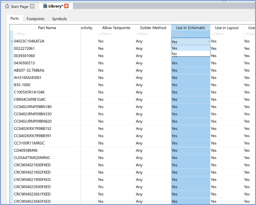 - Select the column header for Use in Schematic. This selects this cell for all parts.