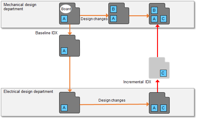| Baseline file | This IDX file is the base design that links the information passed between electrical design and mechanical design teams. Incremental changes that you accept in the Import (IDX): Compare Diff dialog will reset the baseline design. |