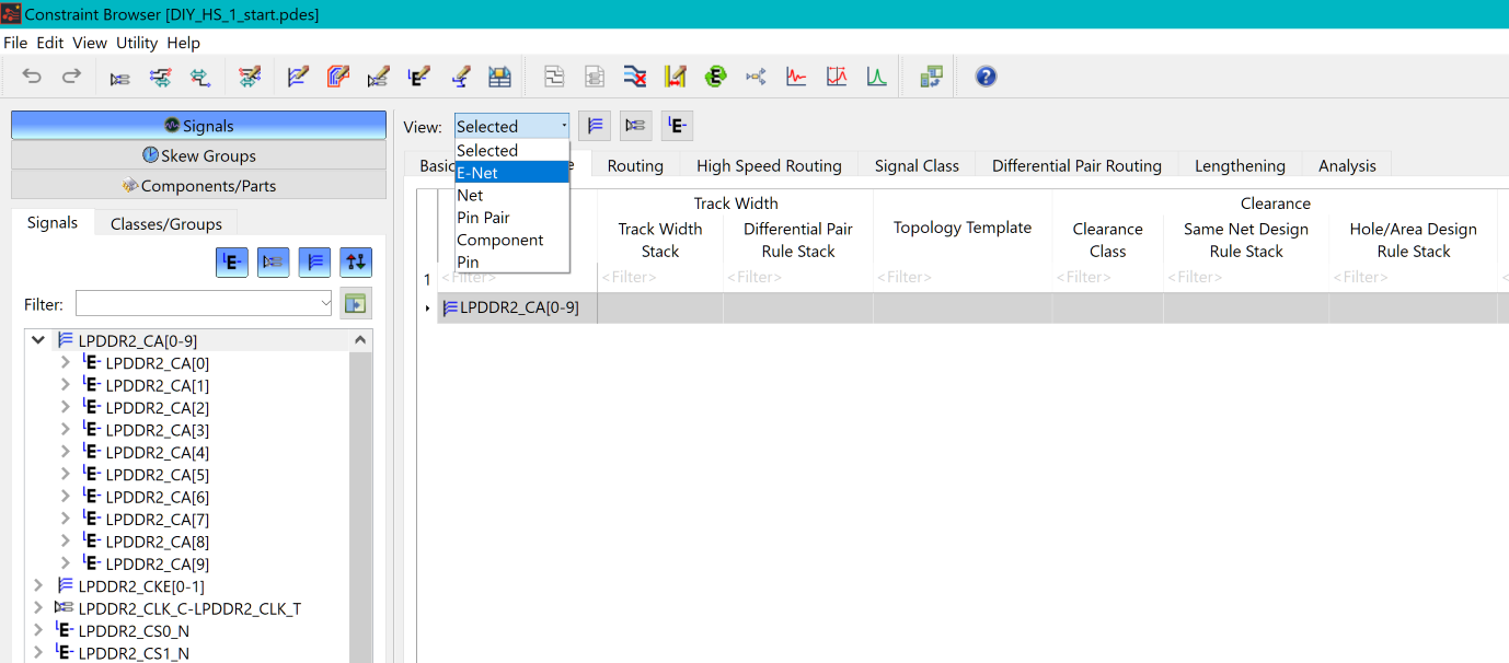 - Using the MyHSDesign1.pdes design from the previous topic, ensure that the View box in Constraint Browser is set to E-Net.