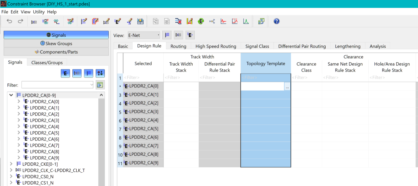 - Select the Design Rule tab as shown below, and select all signals in the Topology Template column.
