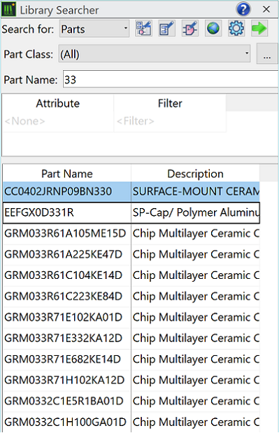 - Experiment with the Search for and Part Class boxes to search for other parts, footprints or symbols.
