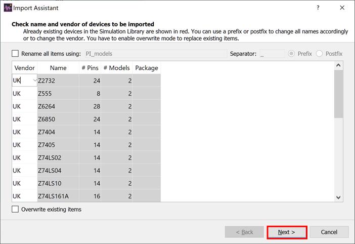 - The Import Assistant dialog lists the devices that are imported from the selection. If items are highlighted in red, then they are already in the design's simulation library. Ensure that the Rename all items using check box is not selected, and then click Next.