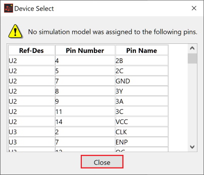 - In the report dialog, click Close. When devices are assigned to components, a report dialog is displayed which shows component pins that are not assigned to a pin model. This occurs when the pin on the component is not connected to a net.