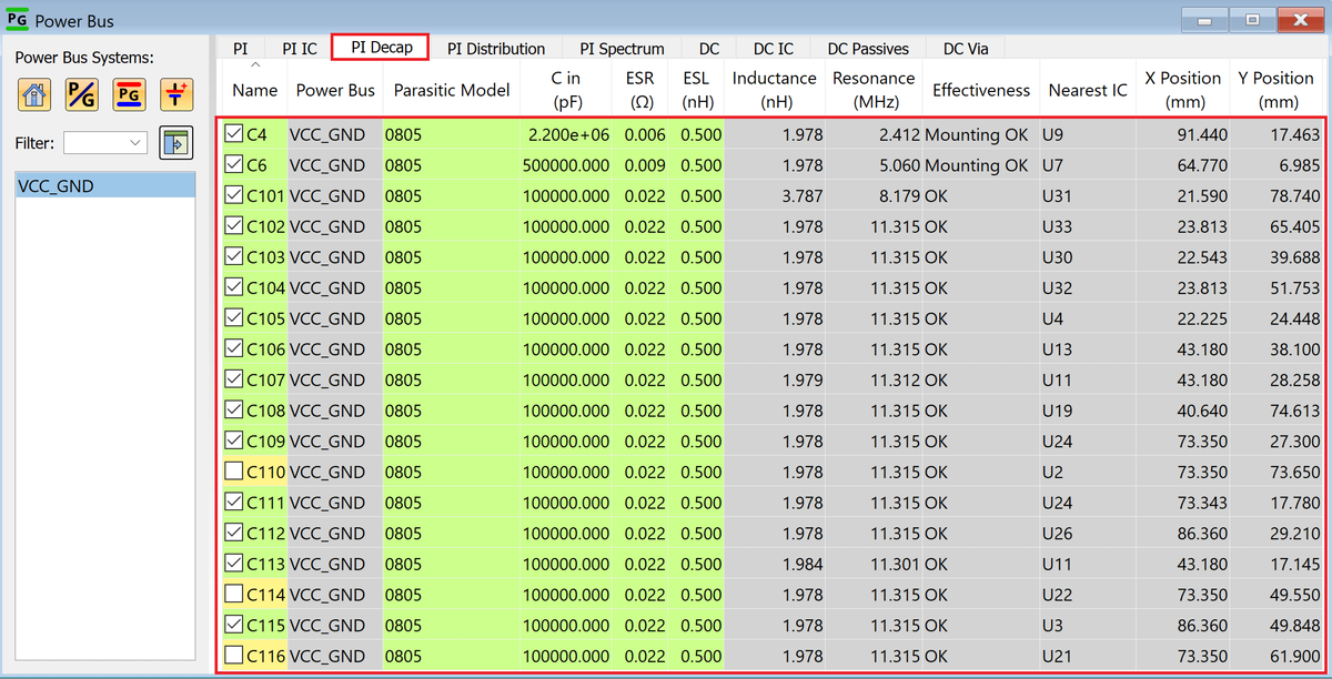 - In the PI/EMI Analysis module, select the Power Bus view, PI Decap tab. For each decoupling capacitor, the following values are displayed in this tab: capacitance, inductance, resistance frequency, connected bus power name (supply source), nearest IC, etc.