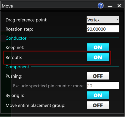 - In the Move dialog, ensure that Reroute is set to ON. The tracks between the component pins and vias are rerouted.