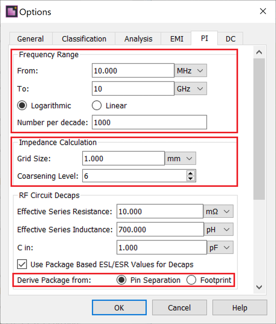 - The Impedance Calculation group contains parameters that are used to control analysis meshes. Grid Size defines the minimum mesh size, set “1.0 mm”. Coarsening Level defines the maximum coarseness level of meshes, set to “6”.