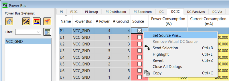 - In the Filter list, select VCC_GND. ICs that connect to the selected Power Bus are displayed.