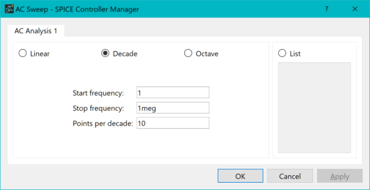 SPICE Controller Manager. - Select AC sweep Analysis and click OK.